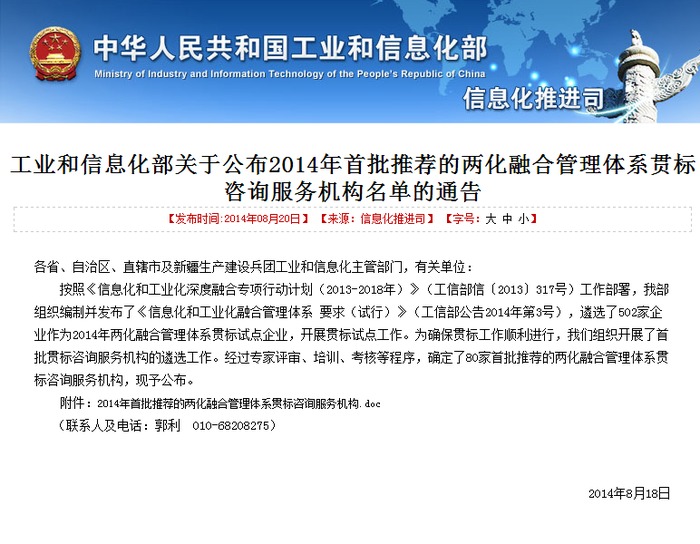 按照《信息化和工業(yè)化深度融合專項(xiàng)行動(dòng)計(jì)劃(2013-2018年)》(工信部信〔2013〕317號(hào))工作部署,工信部組織編制并發(fā)布了《信息化和工業(yè)化融合管理體系要求(試行)》(工信部公告2014年第3號(hào)),遴選了502家企業(yè)作為2014年兩化融合管理體系貫標(biāo)試點(diǎn)企業(yè),開(kāi)展貫標(biāo)試點(diǎn)工作。為確保貫標(biāo)工作順利進(jìn)行,工信部信息化司組織開(kāi)展了首批貫標(biāo)咨詢服務(wù)機(jī)構(gòu)的遴選工作。經(jīng)過(guò)專家評(píng)審、培訓(xùn)、考核等程序,確定了80家首批推薦的兩化融合管理體系貫標(biāo)咨詢服務(wù)機(jī)構(gòu),中國(guó)機(jī)械工業(yè)企業(yè)管理協(xié)會(huì)通過(guò)層層考核評(píng)審,成為80家獲得貫標(biāo)咨詢服務(wù)機(jī)構(gòu)資質(zhì)中唯一一家協(xié)會(huì)組織。