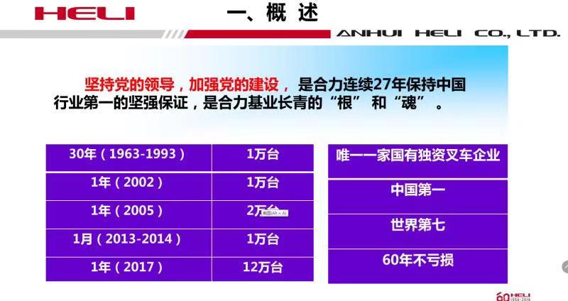 現(xiàn)場交流活動部分,合力系統(tǒng)地、多維度地向與會代表分享了集團發(fā)展的戰(zhàn)略思考和實踐做法。合力黨委書記、董事長張德進介紹了公司60年的發(fā)展歷程。合力是安徽省國資委獨資企業(yè),主營業(yè)務為工業(yè)車輛、工程機械及關鍵零部件的研發(fā)、制造與銷售,是我國規(guī)模最大,產(chǎn)業(yè)鏈條最完整,綜合實力與經(jīng)濟效益最好的工業(yè)車輛研發(fā)、制造和銷售基地。世界工程車輛協(xié)會主席單位。經(jīng)過60年的發(fā)展,合力產(chǎn)品目前在線生產(chǎn)的2000多種型號、500多類全部擁有自主知識產(chǎn)權,產(chǎn)品綜合性能處于國內領先、國際先進水平。主導產(chǎn)品通過歐盟、美國和ISO體系等相關認證。