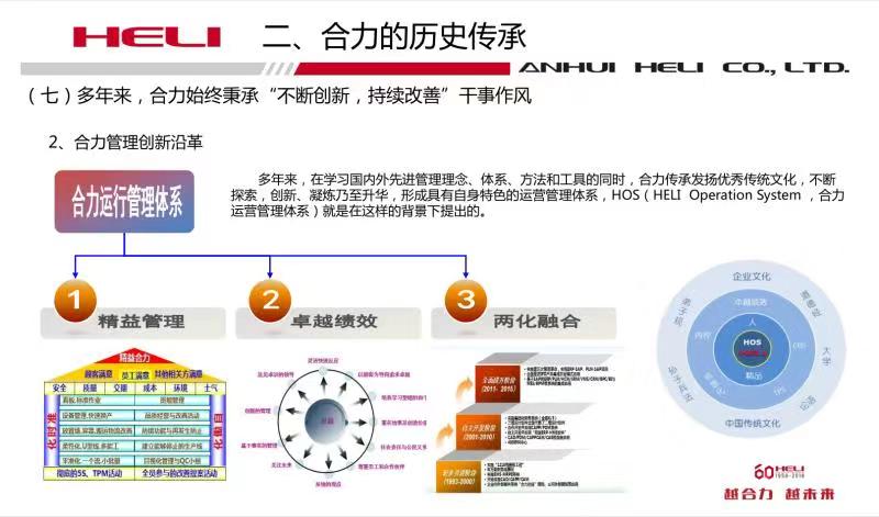 合力副總經(jīng)理都云飛介紹了卓越績效模式導入、推進、成效和體會;集團政治處處長金世林介紹了黨建與經(jīng)營融合的探索與實踐;研發(fā)部副部長畢勝介紹了IPD(集成產(chǎn)品開發(fā))管理體系建設;信息化部副部長張紀九介紹了集團工業(yè)互聯(lián)網(wǎng)建設;合力合肥鑄鍛廠廠長解明國介紹了創(chuàng)新引領傳統(tǒng)產(chǎn)業(yè)轉型升級之路;合力精益辦主任、企管部副部長陳軍介紹了企業(yè)基于方針目標管理體系的合力精益實踐。