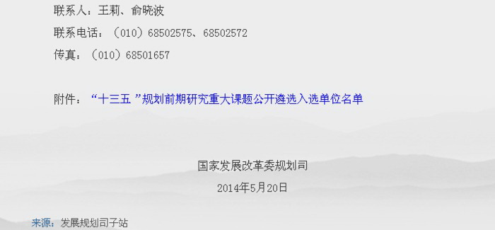 4月23日,我委召開新聞發(fā)布會,公布“十三五”規(guī)劃前期研究重大課題遴選公告,向社會公開遴選研究單位。本次遴選活動得到了科研單位、高等院校等研究機構(gòu)的積極響應和大力支持。截至5月5日(以郵戳為準),共收到265份課題申請書。經(jīng)專家嚴格評審,現(xiàn)將擬承擔重大課題研究的27家單位予以公告(具體名單附后)。